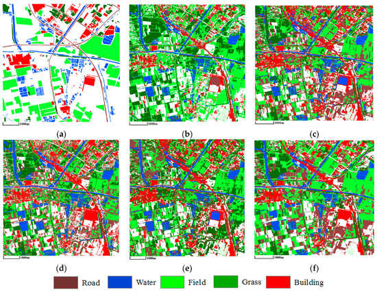Classification results of various methods for the ZY-3 image. (a) Ground truth map; (b) O_ISODATA; (c) O_LDA; (d) msLDA; (e) HDP_IBP; and (f) mSegLDA.