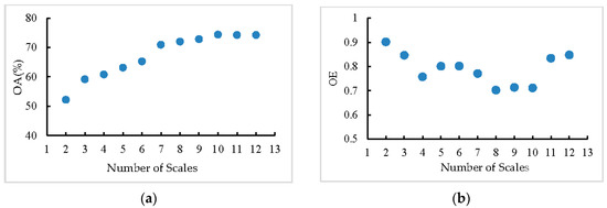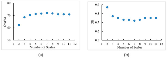 OA and OE versus the number of scales for the Mapping Satellite-1 image. (a) Influence on OA; and (b) influence on OE.
