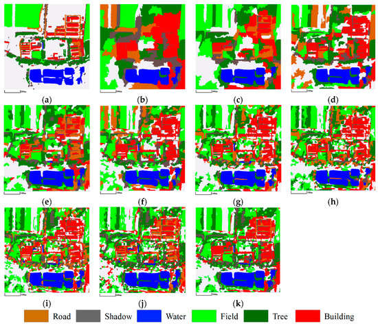 Classification results of nine special cases of the mSegLDA for the QuickBird image. (a) Ground truth map; (b) Case #1; (c) Case #2; (d) Case #3; (e) Case #4; (f) Case #5; (g) Case #6; (h) Case #7; (i) Case #8; (j) Case #9; and (k) mSegLDA.