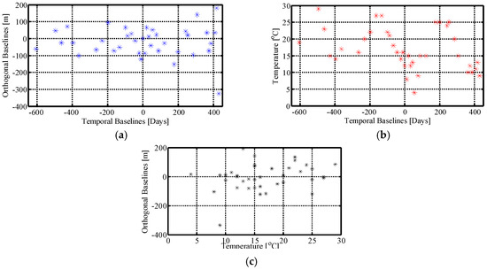 (a) distribution of the spatial baselines (orthogonal components) vs. the temporal baselines; (b) distribution of the temperature values vs. the temporal baselines; (c) distribution of the spatial baselines (orthogonal components) vs. temperature values.