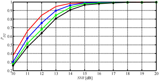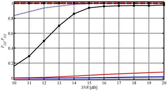 Probabilities of detection PD1 and PD2 for Fast-Sup-GLRT, with a fixed PFA = PFD2 = 10−3, M = 38 and different values of SNR, for two scatterers at distance Ds = 3.1 m, and exhibiting thermal dilation. The PD1 (in dashed line) and PD2 (in solid line) for the 3D detector are shown in red for k = 0.3 mm/°C, and in blue for k = 0.4 mm/°C. The PD1 (in dashed line) and PD2 (in solid line) for the 5D detector are shown in black and are the same for both the thermal coefficient values.