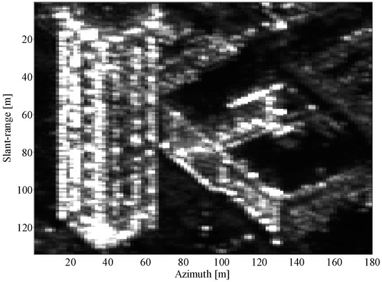 In processing simulated and real data, we limit the search to two targets (Kmax = 2) per resolution cell, since, in urban applications, the number of scatterers is usually assumed to be one or two, as in all the reported references. In [34], the detection performance of Fast-Sup-GLRT in the 3D case has been extensively analyzed. It was shown that, if the product of the number of acquisitions for the SNR (Signal to Noise Ratio) is sufficiently high, two scatterers can be detected as distinct scatterers, and correctly located, with a probability of detection very close to one and a probability of false alarm very close to zero, even if their spacing is lower than the Rayleigh system resolution.