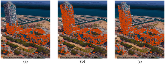 Single scatterers detected and positioned on 3D Google Earth optical image, using 3D Fast-Sup-GLRT (a); 5D Fast-Sup-GLRT (b); and 5D SGLRTC (c).