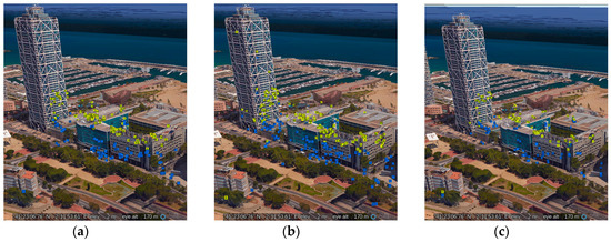Double Scatterers (first in blue, second in yellow) detected and positioned Fast-Sup-GLRT on 3D Google Earth optical image, using 3D Fast-Sup-GLRT (a), 5D Fast-Sup-GLRT (b), and 5D SGLRTC (c).