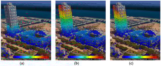 Scatterers detected and positioned on 3D Google Earth optical image. Height values have been used for colorization of the points (single circle, double square): using 3D Fast-Sup-GLRT (a); 5D Fast-Sup-GLRT (b); and 5D SGLRTC (c).