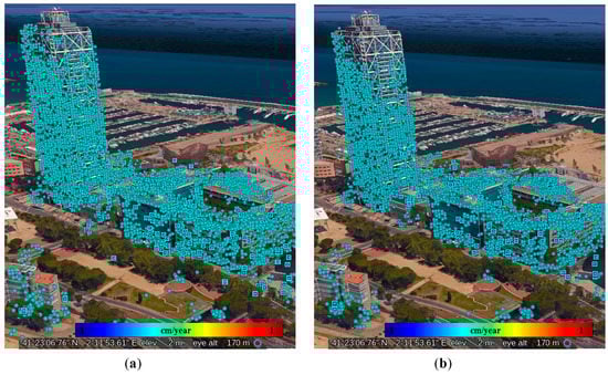 In Figure 10 and Figure 11, we report the estimated average deformation velocity map, with velocity expressed in cm/year, and the estimated thermal dilation map, with dilation coefficient expressed in mm/°C, obtained using 5D Fast-Sup-GLRT (a) and 5D SGLRTC (b).
