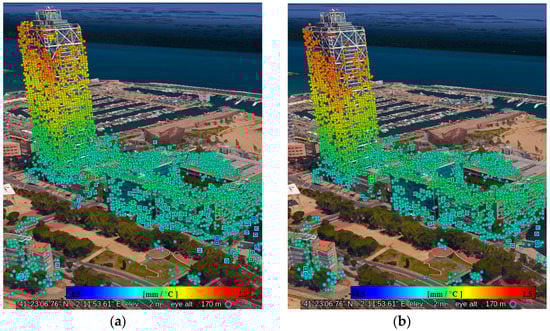We note that there is no deformation velocity while the contribution of thermal dilation is considerable for the taller building. In fact, the main structure of the Art Hotel Tower is external and completely in steel, hence directly exposed to the seasonal temperature changes. The thermal map shows values that roughly range from 0 to 1.5 mm/°C, compatible with a coefficient of thermal expansion of 12 × 10−6/°C for a steel structure of 154 m. For the other building concrete made, the values of the thermal map roughly range from 0 to 0.3 mm/°C, and are compatible with a coefficient of thermal expansion of 9.8 × 10−6/°C for a concrete structure of 41 m. There are not significant differences between the two methods. We cannot provide a ground truth validation of the obtained results, but, in [8], an experiment is presented on the same test site where the thermal dilation coefficients on the Art Hotel Tower, estimated from 28 StripMap TSX images and using an extended PSI model, were compared with those derived by Ku-band Ground Based SAR (GBSAR) data, finding a good agreement. The range values of the thermal dilation map estimated by Fast-Sup-GLRT is in accordance with the values estimated in [8].