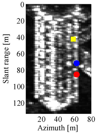 For highlighting the layover effect and the double scatterers localization, the scatterers detected with 5D Fast-Sup-GLRT have been projected onto the ground range-height plane and plotted in Figure 7 (single scatterers in red, lower double scatterers in blue, higher double scatterers in yellow). The ground plane, the layover areas and the roofs appear clearly distinguishable. Moreover, it appears that the higher double scatterers are prevalently located in the layover area on the skyscraper façade and on the lower building roof, while the lower double scatterers are prevalently located on the ground structures. In Figure 8 the detected scatterers are positioned on 3D Google Earth optical image. Height values have been used for colorization of the points (single circle, double square): using 3D Fast-Sup-GLRT (a); 5D Fast-Sup-GLRT (b); and 5D SGLRTC (c).