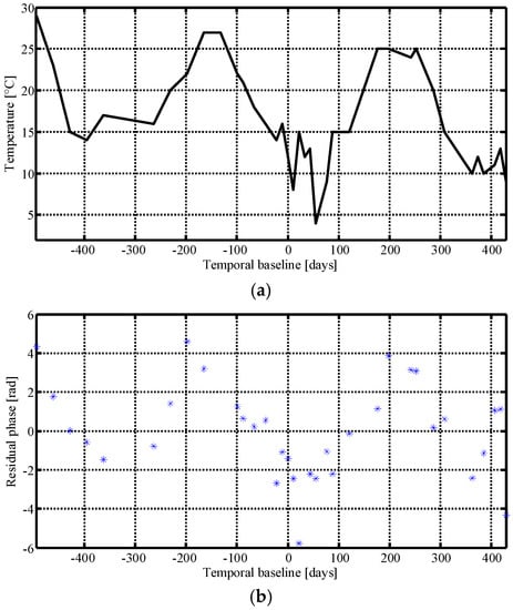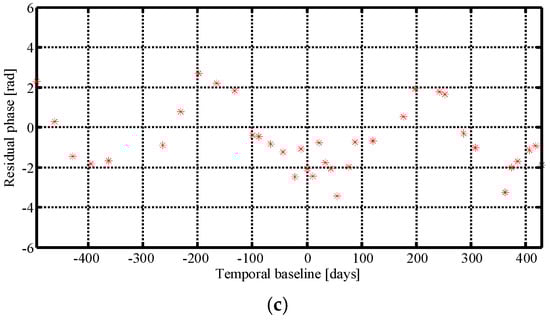 For showing the importance of separating double targets, when present, we considered the results obtained by setting Kmax = 1, which amounts to searching only single scatterers. In this case, 115 of the 292 double scatterers are still detected as single scatterers, while the others are lost. Anyway, the estimate of their height and/or deformation velocity and thermal dilation coefficient can be different from the one provided by the search of double scatterers. For instance, the double scatterer considered previously, shown with a yellow square in Figure 12, is still detected as a single scatterer with an estimated height of about 42 m and a thermal dilation coefficient of 0.3 mm/°C. To verify if this estimate is satisfying, we report the residual phase of the considered pixel of the image stack, after topographic term compensation, in Figure 15c. It is quite evident that the accordance between the residual phase values and the estimated linear phase is weaker than the one found in the double scatterer case. This example shows that the separation of double scatterers is important for obtaining more accurate estimates of height, deformation velocity and thermal dilation coefficient in urban structures’ monitoring.