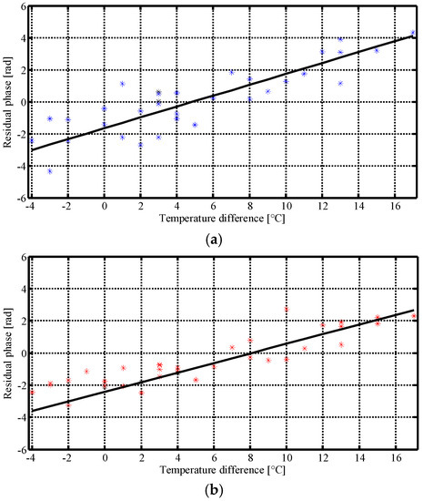 (a) residual phase vs. temperature for the blue scatterer in Figure 12 (blue asterisks) and linear behavior of its estimated thermal dilation (black, solid); (b) residual phase vs. temperature for the red scatterer in Figure 12 (red asterisks) and linear behavior of its estimated thermal dilation (black, solid).