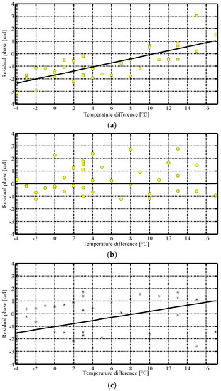 Residual phases vs. temperature for the yellow double scatterer in Figure 12: (a) residual phase for the higher scatterer (yellow squares) and linear behavior of its estimated thermal dilation (black, solid); (b) residual phase for the lower scatterer (yellow circles) and linear behavior of its estimated thermal dilation (black, solid); (c) residual phase for the single scatterer detected using Kmax = 1 (black asterisks) and linear behavior of its estimated thermal dilation (black, solid).