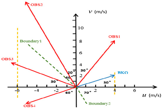 Here, and are the wind speed and direction from the background, respectively, and and are the observational errors for wind speed and direction, respectively. By this method, the observational error of wind direction is considered for the wind observations. The details of this method were described in Huang et al. [18].