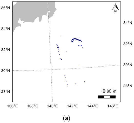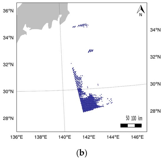 On 3 April 2014, the European Space Agency (ESA) launched the C-band Sentinel-1A satellite. They acquired the first Sentinel-1 typhoon image in the northwest Pacific on 4 October 2014 [20]. Sentinel-1 provides free and open SAR data for ocean, land changes, and emergency response applications, and the data have been utilized in research for hurricane/typhoon studies [21,22,23]. Sentinel-1 has four operational modes, i.e., Strip Map Mode, Interferometric Wide Swath Mode, Extra-wide Swath Mode, and Wave Mode. Sentinel-1 has selectable single polarization (VV, vertical transmit and vertical receive or HH, horizontal transmit and horizontal receive) for the Wave Mode and selectable dual polatization (VV + VH, vertical transmit and horizontal receive or HH + HV, horizontal transmit and vertical receive) for all other modes. In this study, an Extra-wide Swath Mode dual polarization (VV + VH) SAR image is used to derive the sea surface wind map of Typhoon Lionrock (as shown in Figure 1). Its swath is 400 km, and its spatial resolution is 25 × 100 m.