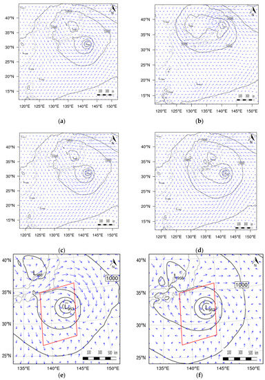 Figure 5 shows the wind fields at 10 m at 0900 UTC 29 August 2016. The Figure 5a,b, show the wind fields at 10 m from the NCEP FNL data and from the background field, respectively. The center of the typhoon in the FNL data is at 142°E, 32°N, while the typhoon center in the background is further north than the location in the FNL data. It can be seen from Figure 5a that the typhoon center of the real wind field is basically symmetrical and the wind field in the typhoon revolves around the typhoon center in the reverse clock direction. Compared with the real wind field, the center of the typhoon in the background field from Figure 5b is not obviously symmetrical. The direction of the wind field around the typhoon center is also counter-clockwise, but the strength simulation was significantly weaker than the real wind field. Moreover, the vortex structures and the pressure are very different in the two panels.