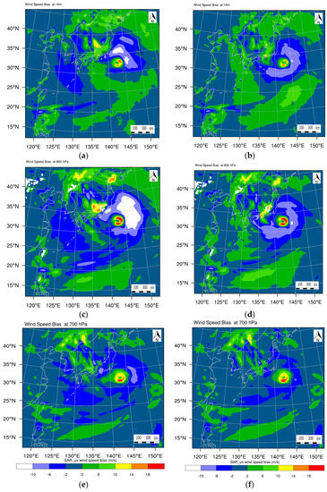 The top two panels are the analysis bias of the wind speed at 10 m. There is an area of bias of −6 to −2 m/s in SAR_sd, and the area of bias is significant smaller than the area of SAR_uv out of the periphery of the TC. Generally the minimum bias of −2 to 2 m/sis the dominance area of the two panels, and this kind of area in SAR_sd is larger than in SAR_uv. These results indicate that the analysis by SAR_sd at 10 m is more accurate than that of SAR_uv. The middle two panels show the analysis bias of wind speed at 850 hPa. Figure 6c shows that, although there is an area of analysis bias of SAR_sd lower than −10 m/s in the northeast of the TC center, the bias is small in the southwest of the TC center, where many SAR sea surface wind observations exist. There is a large area of bias of −6 to −2 m/s in the west of the periphery of the TC from SAR_sd; this indicates that, in this area, the wind speed of SAR_sd is slower than the true wind field. Figure 6d shows there is a large area of analysis bias of −10 to −6 m/s just around the TC center from SAR_uv. There is a large area of analysis bias of 2 to 6 m/s in the periphery of the TC from SAR_uv, indicating that the wind speed is larger than the true wind field in this area for SAR_uv. Figure 6e,f show the analysis bias of wind speed at the 700 hPa for SAR_sd and SAR_uv, respectively. The two panels are similar, the main bias is −2 to 2 m/s, the lower bias is more from SAR_sd, and the higher bias is more from SAR_uv. The results at 500 hPa and 300 hPa are almost the same; the figures are not shown.