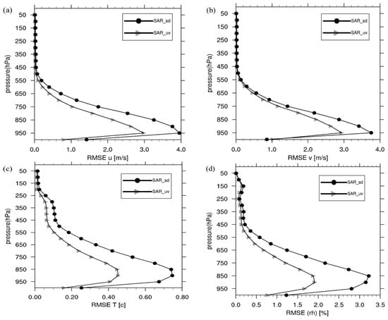 Figure 7 presents the average root mean square error (RMSE) of the analysis increment for both the SAR_sd and SAR_uv experiments. The analysis of u wind, v wind, temperature, and relative humidity is described in Figure 7a–d, respectively. The results from Figure 7a,b are almost the same. It can be seen that the SAR wind observations improved u and v analysis mainly from the surface to 450 hPa. Above 450 hPa, the analysis increment is nearly 0 and the information on u and v comes from the background. For the analysis of both u and v, the RMSE increment of the two experiments reached the maximum at 950 hPa. For the Figure 7c,d, it can be seen that the analysis increment exists in the whole vertical layer for both temperature and relative humidity. The maximum RMSE exists between 850 hPa and 800 hPa, and the RMSE of temperature is smaller than that of relative humidity. Generally, from the four panels, the results show that the RMSE from SAR_sd is larger than the RMSE from SAR_uv; this indicates the assimilation of spd and dir has larger improvement than the assimilation of u and v for the same SAR sea surface wind.