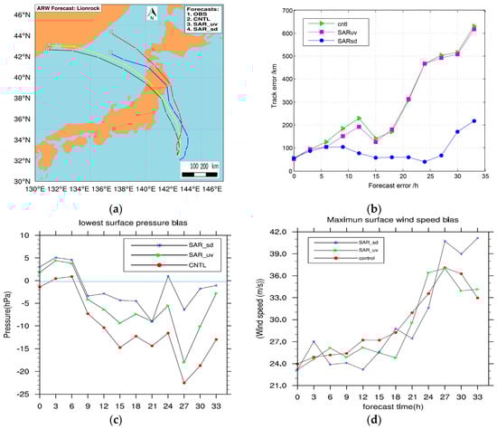 Mean absolute track error, MSLP error, and mini and absolute maximum wind speed error as a function of forecast range for Lionrock are shown in Figure 8b–d. We found that the track errors of SAR_uv and CNTL are almost the same, and they consistently increase, excepting the 15 h and 18 h forecast. The track error of SAR_sd is smaller those that of SAR_uv and CNTL, excepting the first 3 h, and is basically within 100km. The time after the 24 h forecast is the landing time for Lionrock; the track error from SAR_sd is about 45 km and is the smallest in the whole forecast time. The positive impact on the track forecast lasted for 27 h in SAR_sd, but the track error increases after 27 h. The MSLP error from SAR_sd is almost less than 5hPa for the whole forecast time, excepting the time after the 21 h forecast, and reached the minimum after the 9 h forecast even though it is the largest in the first 9 h compared with CNTL and SAR_uv. The maximum wind speed bias of SAR_sd is smaller than that of SAR_uv and CNTL during the forecast time 5~15 h and 20~25h. However, the bias from all three experiments is larger than 22 m/s, which may be related to the lack of perfection of the model itself [40].