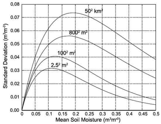 Relationships between the mean and standard deviation of point-scale soil moisture measurements sampled in different spatial extents (2.52, 1002, 8002 m2, and 502 km2) [20].