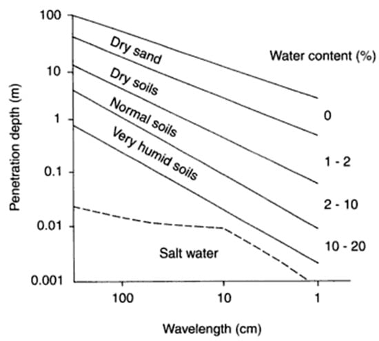 Penetration depth of microwaves and radio waves in various types of soil [31].