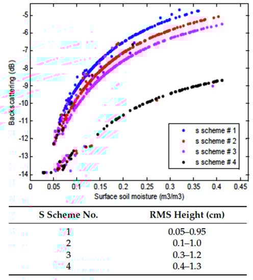 Nonlinear error propagation of roughness to SAR soil moisture [61]: ASAR backscattering differently retrieved soil moisture products under four roughness conditions indicated in Table. Only scheme #4 is outside of an optimal roughness range.
