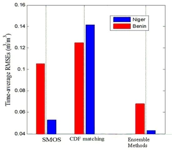 Time-average RMSEs (m3/m3) of the original SMOS data, CDF matching, and retrieval ensemble approaches [52].