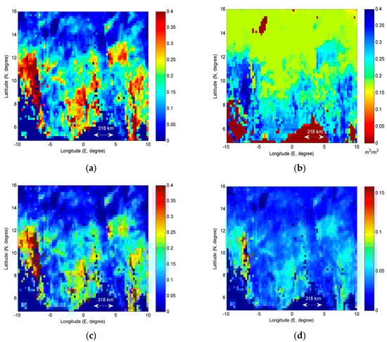 Retrieval error information is often provided by Quality Control (QC) flags, which include a cost function information to be reached at the end of the retrieval process, retrieval errors of each parameter product, confidence level on retrieved soil moisture, RFI, several node information of rain, snow, frozen soils, forest or open water required to improve the quality of brightness temperature data [12,55,58]. In general, QC science flags are very useful and informative, but often not sufficient to interpret, use them as error information required for data assimilation. QC information only indicates how the system treats a single step of several retrieval processing steps, not conferring the integrated error information in the unit of soil moisture.