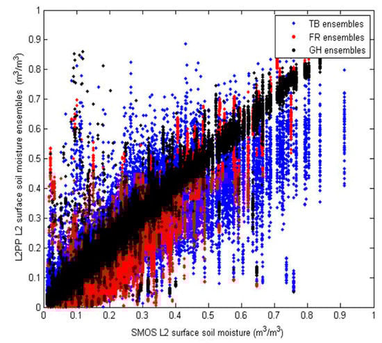 The propagation of error sources discussed above in Section 2.2.2 are dependent on a type of remote sensor, wave length, climatology and retrieval algorithms used. Every satellite product has their own error characteristics. For example, an L-band is designed to be less sensitive to geo-physical conditions such as soil roughness or vegetation, while active microwave sensors at higher frequencies are more sensitive to them [60]. If the retrieval algorithm has a decision tree to select the retrieval model that represents the dominant land cover at sub-pixels, then sub-pixel land surface heterogeneity information quality will considerably affect the final retrievals, in contrast to other retrieval algorithms assuming a time-invariance or uniformity of sub-pixel land surface conditions. Therefore, it is suggested that the perturbation regimes for generating retrieval ensembles should be empirically determined by a sensitivity analysis of retrieval algorithms to be used.