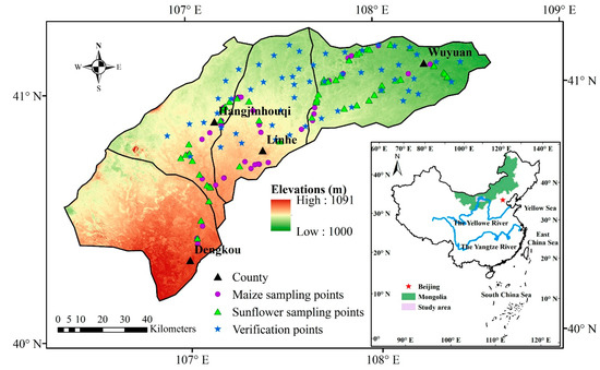 Dominant crops in the study area are summer maize, sunflower and spring wheat. The crop growing season spans from April to October. According to statistics of local government (http://www.bmagri.gov.cn), the planting area of three major crops has changed evidently in recent years (Figure 3). For summer maize and sunflower, the planting area increased from 2009 to 2015, while the planting area of spring wheat decreased significantly. Thus, summer maize and sunflower were considered in the following analysis.