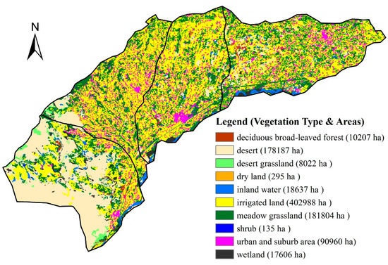 The Hetao Irrigation District is the third largest irrigation district and an important food production base in China. The irrigation district is located in the western part of the Inner Mongolia Autonomous Region in North China. The area of Hetao Irrigation District is 1.12 million ha and the irrigated farmland is 0.57 million ha. In the present research, four counties (Dengkou, Hangjinhouqi, Linhe and Wuyuan) in the district were selected as the study region, which spans from 40.1°N to 41.4°N and from 106.1°E to 109.4°E (Figure 1). The region covers an area of 0.91 million ha, with 44% being irrigated land (Figure 2). The study region is characterized by arid continental climate with an annual precipitation of approximately 160 mm and pan evaporation (20 cm evaporation pan) of approximately 2240 mm. Mean annual temperature is 7.7–9.5 °C from 2009 to 2015, and daily mean temperatures ranging from −16.9 °C in January to 29.1 °C in July. The study region belongs to an alluvial plain of the Yellow River with elevation varied from 1000 m to 1091 m above sea level.