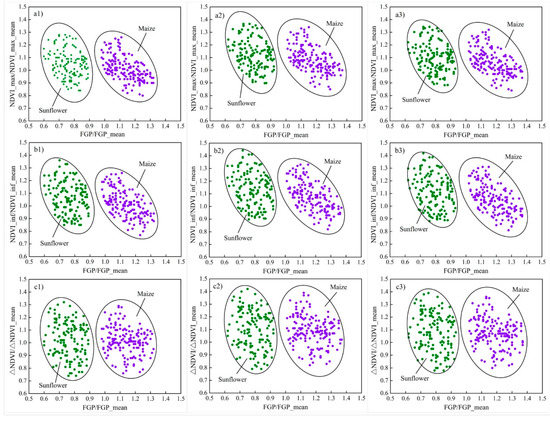 The normalized FGP was negatively correlated with normalized NDVI characteristics (Figure 6). Each combination of the normalized FGP with one of the nine normalized NDVI characteristics formed a phenology-based classifier for the identification of maize and sunflower (Figure 6). Consequently, we have nine phenology-based classifiers, the name and details of the ellipses were shown in Table 5.