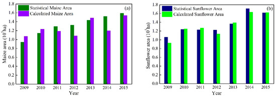 Figure 8 compares the total area of maize and sunflower from official statistics and identified maps. From 2009 to 2015, the identified planting area of maize and sunflower are increasing progressively in general, which is consistent with statistical trends. This proves that this optimal classifier is suitable for multi-year maize and sunflower identification. However, there are also some years with a slightly large identification error. For 2012 and 2014, the areas of maize and sunflower are both underestimated. Especially for maize, the relative errors are −18.09% and −21.17%, respectively. This may be attributed to the less qualified remote sensing images in these two years, which both have fewer available images during the growing season (from DOY 100 to 300) than other years. When images in the key growth period missed, the fitting quality of the logistic curve and the extraction of phenological features will be affected, which may lead to poorer identification results than other years.