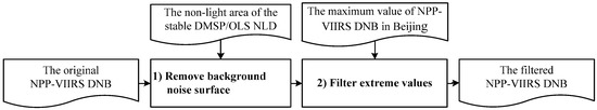 A simple method is employed to remove the outliers from the original NPP-VIIRS data [58]. The pre-processing procedure contains two steps (Figure 2). (1) The first step is removing the background noise surface by DMSP/OLS NLD. The stable DMSP/OLS NLD only contains the persistent light (the lights from cities, towns, etc.), and the ephemeral lights (e.g., fires) have been discarded. Thus, the non-light area (DN = 0) of the stable DMSP/OLS NLD is extracted and overlays NPP-VIIRS DNB to mask out the background noise. This step not only retains the stable night light, but also removes many non-urban areas, thus reducing the data process load. (2) The second step is filtering extreme NPP-VIIRS DNB values. The original NPP-VIIRS DNB values range from −0.42 to 3329.31 nW·cm−2·sr−1; however, 90% of the values are smaller than 332.93, and more than 98% of the values are smaller than 63. The extremely high values that are probably caused by lights from some special places such as airports or fires need to be removed. Since the nighttime light has a positive correlation with the economic development level, the maximum value of light brightness should not be larger than that in the most developed city. According to China Statistical Yearbook 2013, Beijing is the most economically advanced city. A maximum value (235.13) from Beijing is chosen to correct the DNB values. All pixel values that are greater than 235.13 are replaced by the mean value of their neighbor pixels. A total of 84 pixels is reassigned in the study area. The filtered NPP-VIIRS DNB values range from 0 to 235.13 nW·cm−2·sr−1.