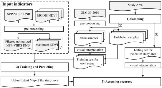 The processing procedure is summarized in Figure 3. Three key steps are included: (1) sampling training and testing samples from the study area; (2) training classifiers for each scene by the BP neural network-based one-class classification method using the filtered normalized NPP-VIIRS DNB and the maximum NDVI as indicators and predicting the urban extent map of the study area; and (3) assessing the accuracy of the classification results using an independent testing set randomly obtained from the entire study area.