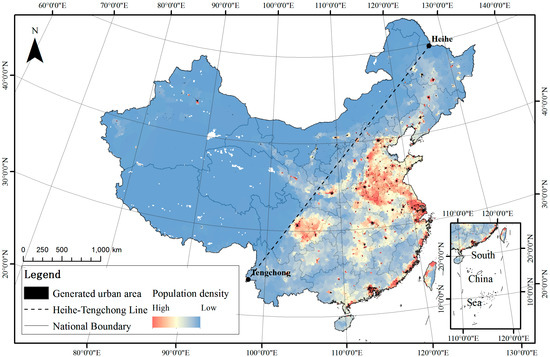 The final urban extent map obtained by the proposed classification scheme is shown in Figure 4. The predicted urban area is 68,023.75 square kilometers (295,242 pixels, approximately 0.71% of the total area). The urban blocks are not evenly distributed, mainly in the north of China and the southeast coastal areas and rarely in the west parts. If we divide the study area into two roughly equal parts by the Heihe-Tengchong Line [80], 87.9% of the urbanized areas are contained to the east of the line, which has the same tendency as the population density. The eastern urban coverage rate is 1.7%, higher than the average.