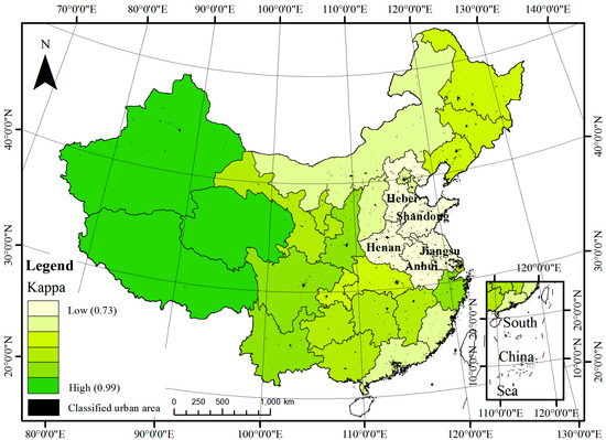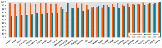 To better understand the classification results, accuracy assessment was also conducted on sub-regions. The study area was divided into 30 sub-regions according to the provincial administrative boundaries. To assure the spread of urban samples in each validation set, at least 50 urban samples were collected in each sub-region. Due to the imbalanced composition of urban and non-urban features, area adjustment was conducted for each accuracy assessment. The number of non-urban samples was based on its coverage rate. All collected samples were manually validated with Landsat images or Google Earth images by visual interpretation. The OA, kappa coefficient, user’s and producer’s accuracy of each sub-region were calculated. The sub-region accuracies are similar to that obtained from the entire study area. The provincial overall accuracies are all greater than 90%, averaging 99.34%. The value of the kappa coefficient varies from 0.73 to 0.99, with an average of 0.848. The kappa coefficients are divided into six classes by equal intervals (Figure 5). The western have a higher kappa than the eastern parts, especially the five provinces with the lowest kappa (0.730, 0.734, 0.761, 0.761 and 0.766 for Henan, Anhui, Hebei, Shandong and Jiangsu, respectively). Figure 6 demonstrates the user’s and producer’s accuracy of each province, which represents the commission errors and the omission errors, respectively. For most provinces, the user’s accuracies (92.49% on average) are higher than the producer’s accuracies (an average of 80.23%), which also remain broadly in line with the results of the whole map.