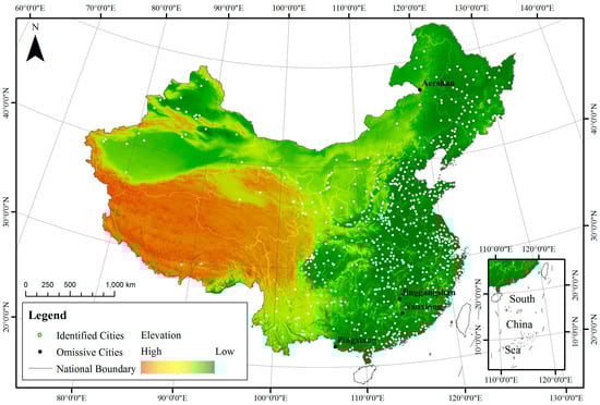 From the spatial distribution perspective, the omissions are distributed mainly in the mountainous regions, and most land areas of the four cities are covered by farmland, grassland or mountain land; the urban blocks are relatively small. For example, Nanxiong, located in the northeastern part of Guangdong Province, is surrounded by the Dayu Mountains; over 80% of the areas of Pingxiang are covered by hilly regions, and the forest coverage of Jinggangshan reaches up to 81.2%. Due to the high coverage of vegetation, the NDVI values in these cities may be relatively higher than other cities. In addition, their population densities are relatively low. For instance, Aershan, an omission case located in the northeastern part of China, only contains a population of 48 thousand, but its land area is 7408.7 km2. Accordingly, the DNB values within the cities, as a signal of human activity, are much lower than a typical city, which may cause the omission errors.