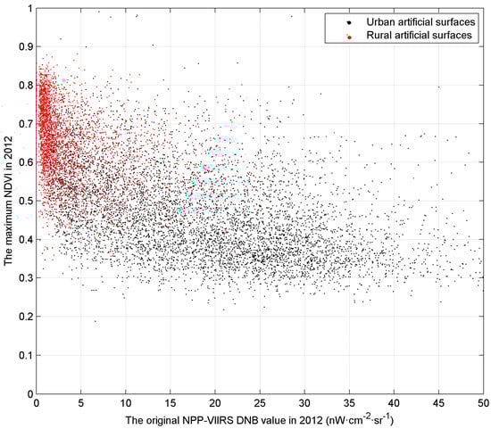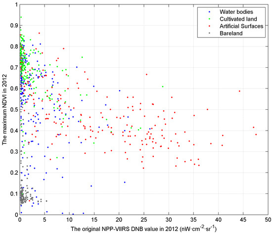 Due to the rapid economic and social development, China’s urbanization rate grew rapidly over the past approximately 38 years. Until the end of 2012, more than 0.71 billion Chinese (about 52% of the population) lived in cities [53]. However, the western economy is obviously lagging behind the eastern, and the city-dwelling populations mainly gather in the east. The economic development in China is extremely imbalanced. Besides, China has wide land coverage (approximately 9.6 million km2), and its geographical features vary greatly from region to region. In the southeast coast, the climate is a continental monsoon climate, while it changes into typical inland dry weather in northwest China. Multivariate climate conditions bring out different vegetation characteristics of cities. As annual average precipitation decreases from east to west, vegetation coverage reduces with the same change tendency. Multiple states of the economy and the geographical differences make China an ideal experimental region for estimating the combination of NPP-VIIRS DNB and MODIS NDVI at continental scales.