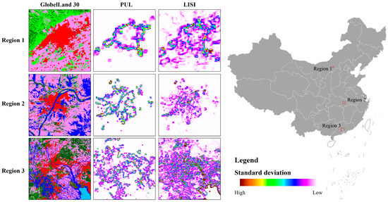 The standard deviations of Present-Unlabeled Learning (PUL) and Large-scale Impervious Surface Index (LISI) in three regions.
