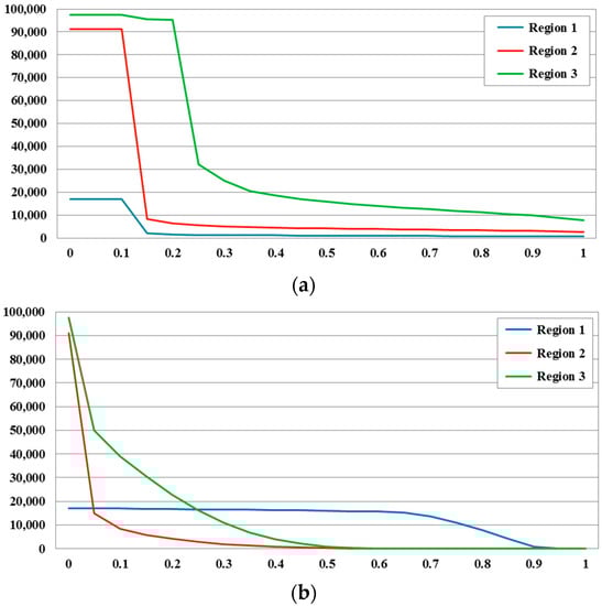 (a) The urban pixel count distributions of PUL in three regions; and (b) the urban pixel count distributions of LISI in three regions. The x-axis is the value of the threshold; and the y-axis is the pixel count of the urban area.