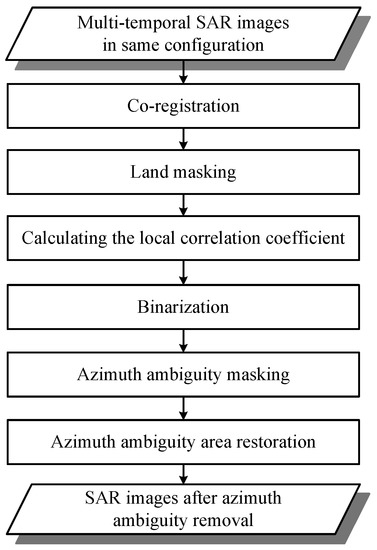 The flowchart of the proposed method. It includes co-registration, local correlation, binarization, masking, and restoration steps. The idea underlying the proposed method is that sea surface is dynamic whereas azimuth ambiguities caused by land-based sources are constant. It is designed to remove azimuth ambiguities caused by fixed land-based sources.