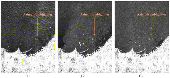 The proposed method is tested on Sentinel-1A IW data first. There are three-temporal images available. The data subsets are presented in Figure 4. They are acquired at 6, 18 February, and 2 March 2017, on Napoli, Italian coast separately. Their polarization modes are VV mode. Azimuth ambiguities are visible in three images, whereas their source targets cannot easily be identified. Thus, it is intractable by using the method by calculating the displacement. QP data is also not available as Sentinel-1 is a dual-polarized system.