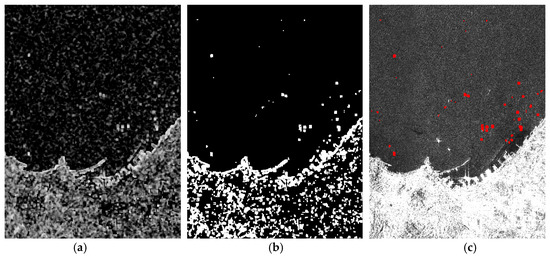 Azimuth ambiguities are prominent, whereas sea clutter is suppressed in the local correlation coefficient map. Thus, azimuth ambiguities can be identified by a binarization operation. Binarization can be achieved by a thresholding method. There are many thresholding methods. In this paper, the thresholding method based on maximum entropy [24] is employed. In this method, two probability distributions and (e.g., object and background) are derived from the original gray distribution of the image. If is the threshold, then the entropy of the object and background are defined as
