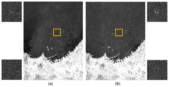 The proposed method is also validated by the Sentinel-1b SM data acquired on Boston, as shown in Figure 10. They are acquired at the 20 March and 1 April 2017, separately. Their polarization modes are HH mode. The zoomed patches before and after restoration in yellow rectangles are also shown in Figure 10. The experimental results show that the proposed method can mitigate most azimuth ambiguities effectively.