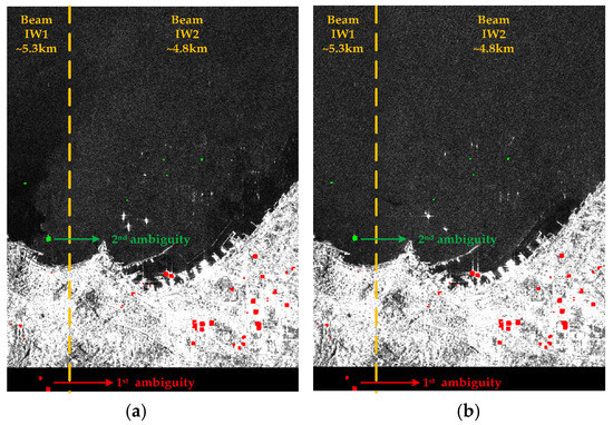Inversion to mask strong land sources, (a) T2 image, (b) T3 image. The strong land sources are masked as red. Note that the azimuth displacement in different beams is different, ~5.3 km in beam IW1 and 4.8 km in beam IW2. Red masks on the land can be recognized as 1st order azimuth ambiguities whereas green masks can be recognized as 2nd order azimuth ambiguities or fixed artifacts on the sea.