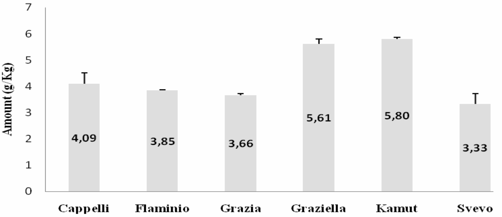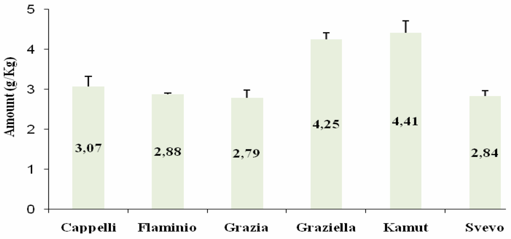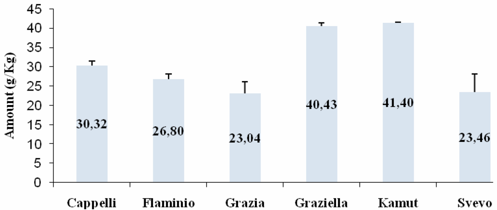 In a preliminary step we assessed the amount of total gliadin in all the accessions using a commercially available gluten test kit (Gliadin ELISA kit, Immunotech, Czech Republic). For each sample, total gliadin content (mg/Kg) was calculated accordingly to the formula reported in manufacturer’s instructions (for details see the Experimental section). As shown in Figure 1, Kamut® (41.40 g/Kg) and Graziella Ra® (40.43 g/Kg) kernels had the greater amounts of gliadin, followed by Senatore Cappelli (30.32 g/Kg), Flaminio (26.80 g/Kg), Svevo (23.46 g/Kg) and Grazia (23.04 g/Kg).