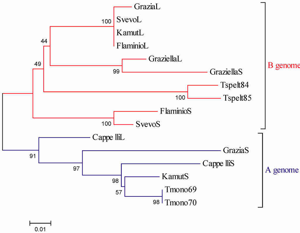 A phylogenetic analysis of the translated full-ORF (Open Reading Frame) α-gliadin genes demonstrated a clustering of the sequences according to their genome of origin. Indeed, by comparison to diploid ancestors, T. monococcum (A genome) and T. speltoides (closely related to B genome), the analysed sequences formed two separate clusters (subtrees) of relatively closely related isoforms in the phylogenetic tree (Figure 6).