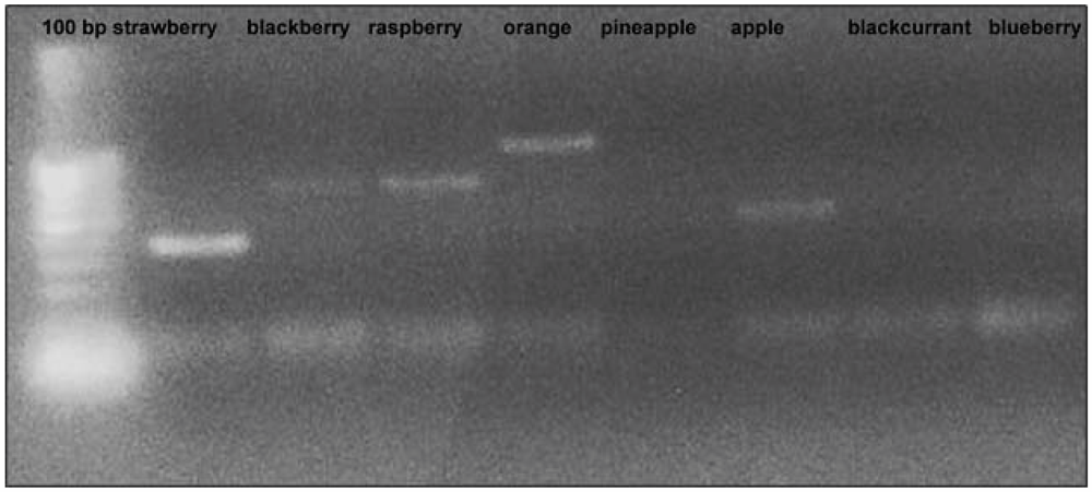 To discriminate between different fruit species, it is necessary to detect sequence-specific amplification products, as in the detection of GMOs [] or other raw materials (hazelnut, olive oil, solanaceae) [,,]. Both primer pairs used in these analyses detected polymorphic profiles that were able to discriminate between our species. Using primer pairs designed from ANS fragments it was possible to discriminate between strawberry, raspberry/blackberry, apple and orange. Using primers PI and PII designed on the 5S rRNA sequence, polymorphic bands were detected in pineapple, orange, apple, raspberry, blueberry and strawberry. Both qualitative analyses were done using the simple PCR technique (Figure 1 and Figure 2) on a real-time PCR platform (Figure 3). In the second case, the fruit species were discriminated using the specific melting temperature of amplicon picks obtained with EvaGreen® fluorescent DNA staining.