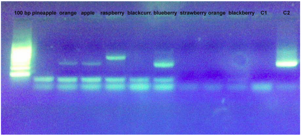 Using EMFxaANS and PI/PII primers for some fruit species revealed the presence of more than one band on the agarose gel, which was supported by the presence of two peaks in real-time PCR. In these cases, it was necessary to sequence single bands cut from the gel. The identity of the polymorphic cut gel bands was determined after purification and sequencing. To determine homologies, with other ANS or 5S sequences of other plant species, the sequencing analysis products were evaluated by a BLAST search within the NCBI GenBank. New sequences were obtained for blueberry, pineapple, raspberry and orange. The new primers designed from these sequences (Table 3) gave us small specific amplification products that were useful for qualitative analyses of “home-made” juices and commercial products.