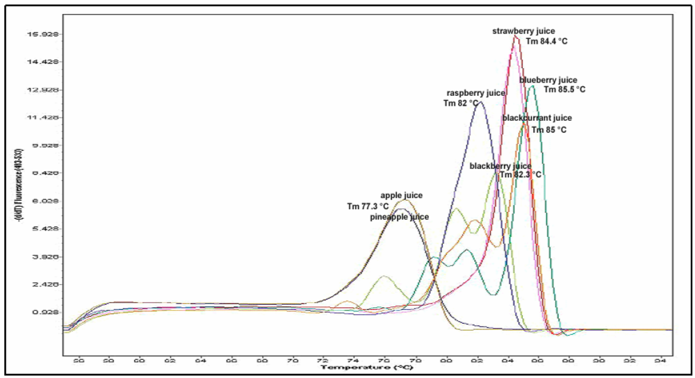 Melting peaks resulting from amplification with EMFxaANS primers showing the different melting temperatures for different fruit juices: pink line - strawberry juice, Tm 84.4 °C; light blue line - blueberry juice, Tm 85.5 °C; blue line - raspberry juice, Tm 82 °C; orange line - blackcurrant juice, Tm 85 °C; green line - blackberry juice, Tm 82.3 °C; brown and dark blue lines - pineapple juice and apple juice, Tm 77.3 °C.