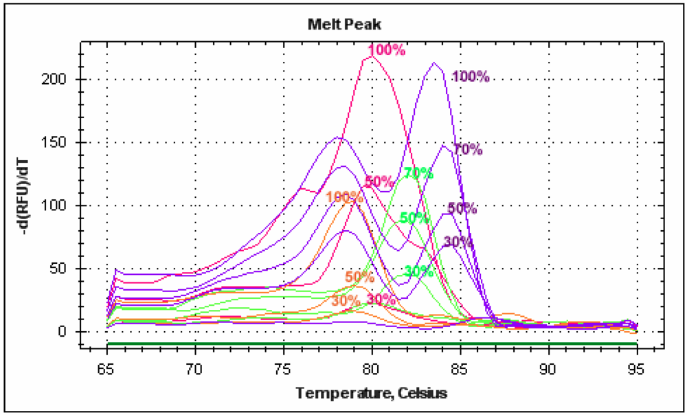 Melting peak profiles of real-time PCRs carried out on mixed juices with the new species-specific primer pairs.
